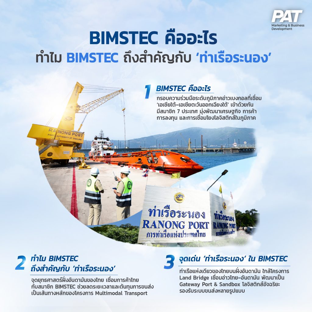 การท่าเรือแห่งประเทศไทย’ ชวนทำความรู้จักกับ BIMSTEC หนึ่งในกรอบความร่วมมือระดับภูมิภาคที่กำลังได้รับความสนใจอย่างมากในขณะนี้ โดยเฉพาะในแวดวงการขนส่งทางเรือของไทย ที่ได้เปิดเส้นทางเชื่อมโยง ‘ท่าเรือระนอง’ เข้าสู่เครือข่ายความร่วมมือนี้ในฐานะประตูสู่ฝั่งอันดามัน ที่พร้อมยกระดับสู่การเป็น Gateway Port เชื่อมภูมิภาคอ่าวเบงกอล เข้ากับเอเชียตะวันออกเฉียงใต้และเอเชียใต้ ซึ่งจะกลายเป็นจุดเริ่มต้นของโอกาสใหม่บนเส้นทางการค้าระดับภูมิภาคที่โลกต้องจับตา