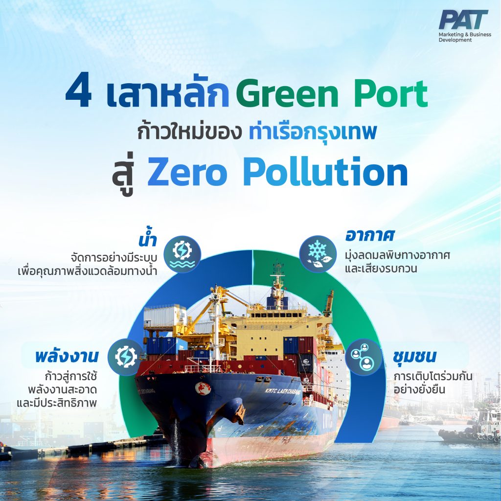 การท่าเรือแห่งประเทศไทย (กทท.) เดินหน้าขับเคลื่อน ‘ท่าเรือกรุงเทพ’ ให้ก้าวสู่ ‘Smart & Green Port’ เพื่อยกระดับมาตรฐานการดำเนินงานให้ทันสมัยตามมาตรฐานสากล และมุ่งสู่เป้าหมายสูงสุด ‘Zero Pollution’ เพื่อคุณภาพชีวิตที่ดีของชุมชนรอบข้าง และคำนึงถึงความรับผิดชอบต่อสิ่งแวดล้อมและสังคมภายใต้แนวคิด Green Port หรือ ‘ท่าเรือสีเขียว