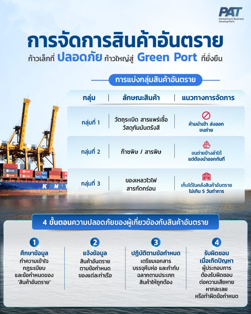 ‘ความปลอดภัย’ และ ‘สิ่งแวดล้อม’ คือสองเสาหลักของการดำเนินงานท่าเรือ โดยเฉพาะเมื่อพูดถึง ‘สินค้าอันตราย’ ที่ต้องได้รับการจัดการอย่างเข้มงวดตามมาตรฐานสากล เช่น ประมวลข้อบังคับว่าด้วยการขนส่งสินค้าอันตรายทางทะเลระหว่างประเทศ (IMDG Code) และระเบียบของการท่าเรือแห่งประเทศไทย